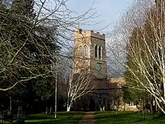 Its chancel, heightened in brickwork, has a reworked 3-pane fifteenth century main window and similar age 5-pane window with a pointed arch facing south by a blocked-off pointed-arch doorway. A sepulchral vault to the Byng family built in rendered brickwork has a round-headed doorway facing their former park to the east. The nave has pointed-arch 5-and-a-half bay arcades, believed to have been built in 1814. The clerestory between the sides above two has 4 small windows per side. Most windows have plain sub-panes. The narrow aisles have two five-pane and four three-pane reworked late medieval windows, a doorway with pointed head of that date and an earlier pointed-arch 3-pane window, a later north-west door and later connection to the Byng vault. It small south porch ends in a gable, above a pointed-arch entrance supported by angle buttresses. The fifteenth century west tower has three stages with opposing square and clasping lightly buttressing walls topped by pale-brick-built battlements of differing heights. The west door has traceried spandrels, surmounted by 3-light window. The roofwork, low-slant, and seating is circa 1814. The font was designed in 1937 by Sir Albert Richardson.[11]