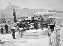 At the start of the 20th century, Southsea Castle formed part of the "Fortress Portsmouth" plan for defending the Solent, the east battery equipped with two BL 6-inch (15.2 cm) Mark VII guns and two BL 9.2-inch (23.3 cm) Mark X guns, and the west battery armed with three 12-pounders (5.4 kg) and one 4.7-inch (11.9 cm) QF gun.[63] During the First World War, the castle was at first manned by Royal Garrison Artillery and Number 4 company of the Hampshire Royal Garrison Artillery Territorials.[64] Later these units were transferred to France and were replaced by the Hampshire Royal Garrison Artillery Volunteers.[64] In response to the threat from German zeppelin raids, a QF 3-inch 20 cwt (10.9 cm 50.8 kg) anti-aircraft gun was added to the castle.[65] Even though the castle remained in active military use after the conflict, by 1929 it had become a tourist attraction, and visitors were able to watch the castle garrison carry out practice firings out to sea.[66] Southsea Common was bought by Portsmouth City Council in 1922 and turned into a park, while the west battery was disarmed in 1927.[67]