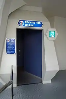 In the queue line, there is an "escape pod". It is a chicken exit that guests can get out of the line if they choose not to ride Space Mountain.[2]