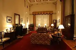 After the death of Joseph Stalin in March 1953, the frozen American-Soviet relationship began little by little to thaw. Communist Party General Secretary Nikita Khrushchev made surprise appearances at the 4th of July receptions at Spaso House in 1954 and 1955. Vice President Richard Nixon stayed at Spaso House when he came to Moscow to open the first large-scale American National Exposition in Sokolniki Park, and dined with Khrushchev at a dinner at Spaso House hosted by Ambassador Llewellyn Thompson. The Cold War was still not over - shortly before Nixon's visit, a microphone was discovered hidden in the chandelier near Ambassador Thompson's office.[13] Nonetheless, five thousand Soviet citizens attended events at Spaso House in 1957, more than in the previous twenty-three years.[14]