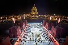 The Spasskaya Tower International Military Music Festival is an annual military music event and military tattoo held in Moscow on Red Square. Participating in the festival are Russian and foreign military bands, folk groups, and honor guard units of foreign countries. More than 40 countries have taken part in the festival since 2006. It is named after the world-famous Spasskaya Tower of the Moscow Kremlin.[1] Its TV partner is TV Centre. The festival's motto is "To Revive Traditions and Preserve History".[2]