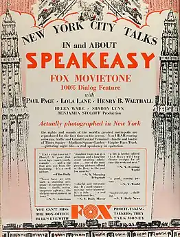 Speakeasy is a 1929 American pre-Code sports drama film directed by Benjamin Stoloff and adapted by Frederick Hazlitt Brennan and Edwin J. Burke. The picture was produced and distributed by Fox Film Corporation. Lola Lane and Paul Page played the lead roles. John Wayne had a minor role in the film as a speakeasy patron. All film elements to this movie are considered lost, but Movietone discs of the soundtrack survive.[1]