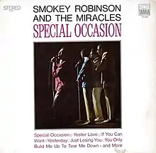 Special Occasion is an album by Smokey Robinson & The Miracles released in 1968. It contains three Top 40 hits: "If You Can Want", "Yester Love", and "Special Occasion". Also included are versions of the Motown hits "I Heard It Through the Grapevine" and "Everybody Needs Love" (both made popular by Gladys Knight & The Pips) and The Beatles' "Yesterday". The album's biggest hit was the uptempo "If You Can Want", which just missed the Billboard Pop Top 10 (peaking at #11), and was performed by the group on their first appearance on The Ed Sullivan Show in 1968. The Miracles were actually the first group to record "I Heard It Through the Grapevine", before the later hit versions by Marvin Gaye and Gladys Knight & the Pips were done, although the master used on this album is a re-recorded version prepared following the release of the Pips' version. This album also includes the popular Miracles regional hit "B" sides, “Much Better Off” (which inspired a cover version by late rapper J Dilla), and “Give Her Up”. “Give Her Up” first appeared on Martha & The Vandellas‘ 1963 album Come And Get These Memories as “Give Him Up”.
