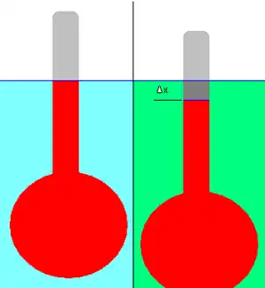 Exactly the same equation applies when the hydrometer is floating in the liquid being measured, except that the new volume is V − AΔx (see note above about the sign of Δx). Thus,