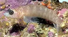 The spectacled triplefin (Ruanoho whero) is a triplefin in the genus Ruanoho. It is commonly found around New Zealand from depths of a few metres to about 30 m, most common in reef areas of broken rock. Its length is between 4 and 8 cm and its head is flattened with large eyes surrounded by a dark band giving rise to its common name. The head and fins have a pattern of fine blue lines. Its large pectoral fins are used as props when resting on the bottom where it spends most of its time.