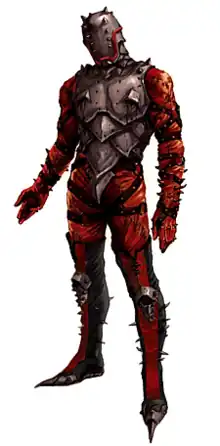 After the events of Stamford, Baldwin believed his powers to be burned out.[30] However, they still exist, but now only manifest when he experiences extreme stimulation, such as intense pain.[30] While his powers are still kinetically based, they no longer appear to manifest as a "bubble field"; rather, his powers seem far more explosive in nature. In order to stimulate his powers, his Penance suit constantly rakes his flesh. Baldwin tolerates this to a masochistic degree, once stating that he would "wear [the suit] all the time if I could."[68] By wearing the suit he has developed a natural tolerance to pain. His suit consists of 612 spikes facing inward, each to represent a person who lost their life in Stamford. 60 of the spikes are longer than the rest, one for each of the children.