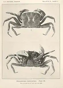 Speocarcinus is a genus of crabs in the family Xanthidae, containing six extant species,[1] one fossil species[2] from the Late Miocene,[3] one fossil species from the Eocene (Lutetian)[4] and one fossil species from the Early Eocene (Ypresian):[5]