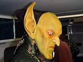 The Green Goblin's original headgear was an animatronic mask created by Amalgamated Dynamics.[125] Dafoe described it as a "Halloween mask" and "kind of silly-looking", and the designers instead came up with a modern, angular helmet.[50] Dafoe also wanted the costume to be flexible enough to allow him to do splits.[126]