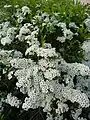 Spiraea × cinerea is a species of flowering plant in the rose family. It is a hybrid of garden origin (S. hypericifolia × S. cana). Growing to 1.5 m (4.9 ft) tall and wide, this compact deciduous shrub bears small, lanceolate leaves and multiple white blooms along its arching stems in spring.