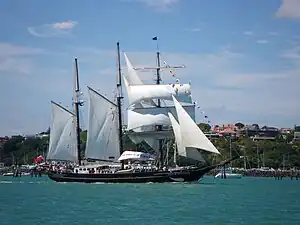 The tall ship Spirit of New Zealand is a steel-hulled, three-masted barquentine from Auckland, New Zealand. It was purpose-built by the Spirit of Adventure Trust in 1986 for youth development. It is 42.5 m in total length and carries a maximum of 40 trainees and 14 crew on overnight voyages. The ship's home port is Auckland, and it spends most of its time sailing around the Hauraki Gulf. During the summer season, it often sails to the Marlborough Sounds and Nelson, at the top of the South Island.
