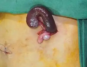 The anomaly was first described in 1883 by Bostroem.[2] Since then more than 150 cases of splenogonadal fusion have been documented, predominantly in males.[3] The condition is considered benign.[4] A few cases of testicular neoplasm have been reported in association with splenogonadal fusion.[5][6] The reported cases have occurred in patients with a history of cryptorchidism, which is associated with an elevated risk of neoplasm.[6]