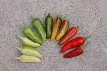 | Santa Fe Grande[18] | Fresno | The Santa Fe Grande is a very prolific variety used in the Southwestern United States. The conical, blunt fruits ripen from greenish-yellow, to orange-yellow to red. The peppers grow upright on 24-inch plants. Santa Fe Grande has a slightly sweet taste and is fairly mild in pungency. | ||||