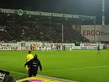 In August 2015, the lease was extended another time, currently until 2050.[7] At the same time, a decision was made to rebuild the main grandstand. The reconstruction took place in two phases: Phase 1, which included the demolition of the now 60-year-old main grandstand and a subsequent new construction with VIP stands, started in January 2016 and was completed by July 2017. To this end, the infrastructure around the stadium was also expanded away from the conversion of the grandstand. The previous training pitches behind the stadium were replaced by car parking spaces, for which a circular road was also drawn around the stadium. During the new construction, makeshift containers were used for changing rooms and media rooms, which were set up behind the back straight. Players entered the stadium through the open corner between the north stand and the back straight. In the second construction phase, which should have lasted until December 2017 but was delayed by several changes of architect and was not completed until the start of the 2017/18 season, the interior of the new main stand was fitted out. This provided the latter with meeting and conference rooms in addition to the infrastructure for the football events. These replaced the previous VIP North building, which had already been dismantled and sold. In its place, the main stand was extended to the north. The gap to the North Stand was closed before the 2018/19 season.[8] It is still planned to extend the main stand to the south, which should thereby replace blocks A and B. [9]