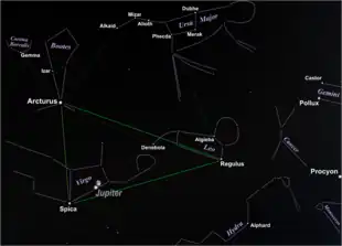 The Spring Triangle is an astronomical asterism involving an imaginary triangle drawn upon the celestial sphere, with its defining vertices at Arcturus, Spica, and Regulus.[1] This triangle connects the constellations of Boötes, Virgo, and Leo. It is visible in the evening rising in the southeastern sky of the Northern Hemisphere between March and May and setting until August, while at morning rising and setting from November to the end of February.