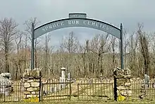 The original cemetery is located across the road, featuring “God’s Acre” at the top of the entrance gate. It is the oldest church cemetery in the township.[4]