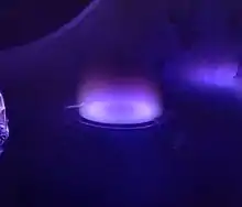 Gas flow sputtering makes use of the hollow cathode effect, the same effect by which hollow cathode lamps operate. In gas flow sputtering a working gas like argon is led through an opening in a metal subjected to a negative electrical potential.[13][14] Enhanced plasma densities occur in the hollow cathode, if the pressure in the chamber p and a characteristic dimension L of the hollow cathode obey the Paschen's law 0.5 Pa·m < p·L < 5 Pa·m. This causes a high flux of ions on the surrounding surfaces and a large sputter effect. The hollow-cathode based gas flow sputtering may thus be associated with large deposition rates up to values of a few µm/min.[15]