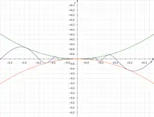 for x close enough to 0. The correctness of which for positive x can be seen by simple geometric reasoning (see drawing) that can be extended to negative x as well. The second limit follows from the squeeze theorem and the fact that