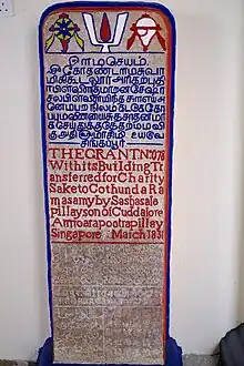 The temple grounds were expanded in 1831 when private land was donated to the temple. This event is recorded on a stone tablet which still stands in the temple. The text inscribed on this tablet reads: "The grant N:075 With its building transferred for charity sake to Cothunda Ramasamy by Sashasalapilly son of Cuddalore Amicarapoatrapilly Singapore March 1831".