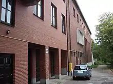 The monastery building was designed by a young architect Zbigniew Kupiec and his older collaborator Tadeusz Kossak, both since the early 1930s active in Gdynia;[71] at that time Kupiec was already renown for a number of residential buildings along the main city street and prestigious villas in the plushy Kamienna Góra district; in total he designed some 40 buildings in Gdynia of the 1930s.[72] Based on L-shaped layout, the monastery edifice consisted of two symmetrical wings of approximately 35 meters length and 15 meters width each. Built in traditional technology and almost exclusively of bricks, it housed 22 individual cells, refectory, communication and common utility spaces; the adjacent large chapel was based on a 275 square meters floor plan, its main hall 7 meters high and with separate entrances from the monastery and for the public. Deprived of architectural novelties it is usually noted as an example of functionalism.[73]
