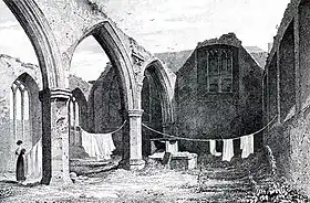 Although many repairs were carried out to the church and tower over the centuries, finance for the maintenance of the structures was always a problem, particularly in the 18th and 19th centuries. By 1825, the church building itself was in a ruinous state (as reported by G. N. Wright) and "very few Protestants" remained in the parish.[6] As the finance to carry out substantial repairs was not available, parts of the church were closed off or unroofed. As a consequence, many ancient tombs gradually crumbled and memorials were removed or rendered illegible by exposure to the weather.