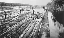 The St. Croix Log Boom used a series of booms—logs chained end-to-end across the river—to catch timber as it floated downstream.[5] Workers called "boom rats" moved among the booms on catwalks, noting the timber marks stamped on the incoming logs and sorting them into holding pens. When enough of one brand were gathered, the boom workers would form them into a timber raft, which a "fitting-up crew" would steer downstream to the correct mill. Some receiving mills were as far south as St. Louis.[4]