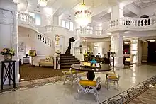 The new owners embarked on a major refurbishment programme undertaken by the theatre architect J. P. Briggs (1869–1944),[7] providing a spectacular sequence of public reception rooms with very rich plasterwork. Briggs remodelled the far end of the courtyard, creating a neo-Baroque space with raised verandah leading into a double-height foyer dominated by an undulating balcony at gallery level, accessed via a double staircase. In the eastern side of the building Briggs created a double-height ballroom with similar undulating balcony (reminiscent of theatre boxes) and unusual Art Nouveau plasterwork linked by anteroom with the former restaurant (now The Cloisters), the cove of which was decorated with lively rococo plasterwork.