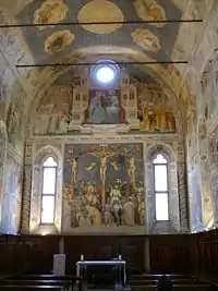 The Crucifixion fresco on the wall above the altar depicts Christ on the cross while Mary weeps below, consoled by apostles and followers. His cross bears a sign reading "INRI," an acronym for the Latin phrase Iēsus Nazarēnus, Rēx Iūdaeōrum ("Jesus the Nazarene, King of the Jews.") Angels surround Christ in the sky, framing him as the central figure, directing the viewer's eye back to him. Altichiero utilizes foreshortening on the flying angels and the grey horse in the foreground to create the illusion of a realistic perspective.[2]
