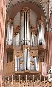 - German: mit größter Wahrscheinlichkeit die erste und einzige gotische Orgelfassade mit einem Zweiunddreißigfuß-Prinzipal (tiefste Pfeife rund 11 Meter lang) in der damaligen abendländischen Welt