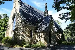 St. Mary's Church is a historic Episcopal church in Abingdon, Maryland. It is a small Gothic Revival parish church It was built about 1851 and carefully designed in the "Early English" manner with gray rubble stone walls, cut Port Deposit granite trim, and a very steep slate-covered roof. It features an ornamental chimney, with a fleur-de-lis, the symbol of the Virgin Mary, in a bas-relief panel. It is the only church in America to have a complete set of stained glass windows designed by William Butterfield, the English Gothic Revival architect. Johannes Oertel did the chancel paintings.[2]