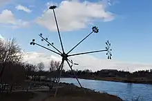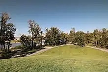 St. Patrick's Island Park (also simply known as St. Patrick's Island) is a 31-acre public park on an island at the confluence of the Bow and Elbow rivers just northeast of Downtown Calgary. St. Patrick's Island is one of Calgary's oldest parks. Its development as a public space began in the 1890s, gaining momentum as an important public space in the Calgary inner city with the construction of a bridge to the island in the early 1900s. Throughout the decades, the island has been transformed, playing host to a campground in the 1960s, to being the host of squatters for much of the period from the 1980s to the 2000s. For several decades, the island was connected to Calgary's undesirable East Village neighbourhood by a steel and wooden bridge. However, in the late 2000s the Calgary Municipal Land Corporation began a redevelopment of the East Village, with a particular focus on redeveloping St. Patrick's Island into a full-fledged city park with programmed activities and physical access to the Bow River. After years of construction, the newly redeveloped St. Patrick's Island Park opened to the public in July 2015, along with the new George C. King Bridge which connects the island park with both the East Village to the south and Bridgeland to the north.