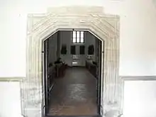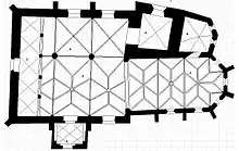Piers in the eastern part of the chancel are finished in about half of the wall above the ground. There is a music gallery on the western side of the church. The gallery is stretched above the width of both naves and it is supported by four octagonal pillars. The pillars are connected by arches. The space under the music gallery is vaulted by ribe – like.