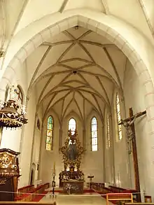 There are two naves inside the church. They do not have the same width, the southern nave is almost twice wider than the northern nave. On the axis of the northern nave, there is a confessional chapel and sacristy. The sacristy is situated under the church's tower. There is a chancel, on the axis of the southern nave. The chancel is vaulted by a net vault. Both naves are separated by two octagonal pillars that carry the weight of the arch. The pillars are decorated by paintings, which resemble the construction block stones. The difference between both naves is not only in size, but also in the type of vaulting. The narrower northern nave is vaulted by three bays of a crossing arch. In the wider southern nave, there is a net vault divided into three bays. The southern nave and the chancel are separated by a triumphal arch. The chancel is slightly narrower than the nave. There is a chapel under the tower behind the northern nave. This chapel is vaulted and there is a sacristy behind it and an oratory above it.