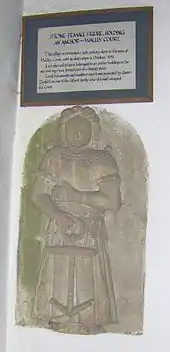 The Victorian square font and pulpit match, but are now largely whitewashed, as is much of the rest of the church.[5] Just inside the porch, on the left of the church door, is a stone figure holding an anchor which was moved to the church from Walley Court with the flooding of Chew Valley Lake. There is an unconfirmed story that this was given to the Gilbert family, then living at the court by Queen Elizabeth I.[6][7] It is possible that it was originally from the site of a nunnery within the parish which was closed with the Dissolution of the Monasteries in 1536.[6]