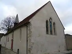The church, a small building which "in scale [is] exactly like churches in nearby villages",[3] is built of stone and flint. The outside walls are rendered apart from at the east end, where the quoins are of stone dressed with ashlar, and the west end which is supported by substantial buttresses.[3] The stonework which has been obscured by render includes some reused fragments of herringbone pattern work of the Norman era and rubble taken from the demolished Roman walls around the city centre.[3] The windows, all lancets, vary in date from 13th- to 19th-century; the three-light east window dates from the latter. The doorway at the west end is 14th-century. On the roof is a weatherboarded bell-cot topped with a short broach spire.[3]