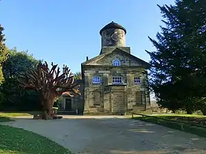 From medieval times West Bretton was partly in the parishes of Silkstone and Sandal Magna and because of its distance from the churches had a chapel of ease.[2] The original chapel was "drowned" when the upper lake was created. It was replaced on a site to the east of the new mansion by the estate chapel dedicated to St Bartholemew by Sir William Wentworth in 1744.[3] The chapel was built with money from Wentworth's wealthy wife, Diana Blackett. Several members of the Wentworth family are buried there including Sir William Wentworth in 1763 and his son Thomas Wentworth-Blackett in 1792.[4] When Bretton Hall was sold to the West Riding County Council in 1949 for use as a teacher training college, the chapel was used as rehearsal space for drama students. The Yorkshire Sculpture Park bought the chapel with Heritage Lottery funding and used it as a music venue and exhibition space. The chapel was closed for renovation in 2013 and reopened the following year.[4]