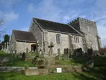 The Grade I listed Saxon church of St Botolph's at Botolphs, West Sussex, England, is situated in the valley of the River Adur and is now part of the Church of England parish of Beeding and Bramber with Botolphs. An earlier dedication to St Peter de Vetere Ponte (St Peter of the Old Bridge) is now lost, like the bridge over the Adur from which it took this ancient name.[1] The church serves the mostly depopulated hamlet of Botolphs in the Horsham district of West Sussex. The church has fragments of medieval wall paintings. Architectural historian Ian Nairn comments that the Jacobean pulpit is "notable in a county which is poor in 17th century fittings".[2]