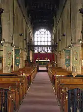 A further restoration was carried out between 1871 and 1873 on behalf of the Ecclesiastical Commissioners. Ewan Christian carried out the work on the chancel and John Douglas was responsible for the rest of the church. This included removal of the whitewash from the interior and adding vaulting under the tower.[4] New oak screens were fitted between the chancel and the chapels, and the seating was replaced in the choir and the nave. Many memorials were removed and the window tracery was renewed.[3]