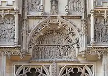 To the left of Christ are apostles Peter, John and Jacob, from the right come soldiers led by Judas. In the seddle finish of the portal is the scene of Pieta, Virgin Mary holding Christ body, surrounded by Maria Magdalene and Mary Joseph. The uppermost relief shows angels holding Veronica's towel with Christ's face print.