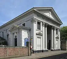 William Hallett, the architect, is not known to have been responsible for any other buildings in Brighton or elsewhere,[4] and he based the design of St John the Baptist's very closely on that of St Mary Moorfields in London, completed in 1820.[7] In particular, the southern frontage – which faces Bristol Road – is almost identical to that of St Mary's. The church is Classical in style, with a stuccoed exterior and a large pediment above the entrance.[4] The shallow roof is made of slate. The entrance porch is flanked by two columns with accompanying pilasters, and there are two more pilasters at the corner of the building. Blind doorways between the two sets of pilasters have small pediments and two deep-set windows above them. Below the main pediment and dentil cornice is a Latin inscription: DEO SUB INVOC. S. JOANNIS BAPT. ("To God, under the invocation of St. John the Baptist.") There is a side entrance in the western face, again with a pediment above it.[4][7]