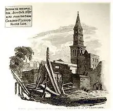 This church originally belonged to the College of St Martin-le-Grand.[3] It was founded in the 13th century by the dean and canons of St. Martin's,[4] to serve the inhabitants of the precinct, who had previously worshipped at the altar of St Leonard in the collegiate church.[1] The building, which was small, stood in the courtyard of the collegiate church, on the west side of Foster Lane.[3]