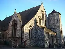 The church is built predominantly of flint with mouldings and window dressings of stone.[3] Internally very spacious,[6] it can hold up to 900 people.[4] Its south and west elevations face the street. At the east end is a three-bay chancel flanked by a Lady chapel and vestry to the south and north respectively. This adjoins the four-bay, north- and south-aisled nave, at the southwest corner of which is the octagonal tower.[3] A substantial, three-stage structure with a shallow cap at the same height as the nave roof, the tower was in fact intended to be much taller and topped with a spire rising to 160 feet (49 m); but the extension and spire were never built.[4][6] The entrance is in a porch which runs along the length of the west face.[3]