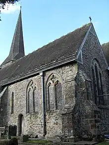 Descriptions of St Margaret's Church include "large and interesting",[15] "the main point of interest ... [in] a village full of charm and beauty",[4] and "a rather typical wealden church ... seeming from every side to form an integral part of the landscape".[22] In this respect it is similar to many ancient churches in the area, established by Norman settlers in forest clearings in the Weald—then a remote area with little access.[22][23] It is built of sandstone rubble quarried from the local area, and has a chancel, nave, Lady chapel and adjacent aisle on the south side, tower with an octagonal spire, vestry in the southwest corner and an entrance porch.[3] The stone is laid in wide courses. Some of the quoins have stone dressings,[1] and Horsham Stone slabs and tiles cover the roof.[3] Although this layout is straightforward and common, the parts are not perfectly aligned and the nave is slightly wider than the chancel on both sides.[5] The dimensions of the nave are 32+1⁄2 by 18+1⁄2 feet (9.9 m × 5.6 m); of the chancel, 37 by 18+1⁄2 feet (11.3 m × 5.6 m); of the Lady chapel, 25 by 15+1⁄2 feet (7.6 m × 4.7 m); of the aisle, 32+1⁄2 by 16 feet (9.9 m × 4.9 m); and of the tower, 12 square feet (1.1 m2).[3] The tower is apparently lower than intended: it extends just 3 feet (0.91 m) above the tops of the corner buttresses.[12] Above it, the "comparatively tall" octagonal broach spire is topped by a copper weather vane.[3]