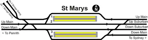 St Marys railway station is a heritage-listed former goods yard, railway signal box and now railway station located on the Main Western line in the western Sydney suburb of St Marys in the City of Penrith local government area of New South Wales, Australia. The station is served by Sydney Trains T1 Western line services. The station marks the end of the four-track section of the Main Western line. It was designed by New South Wales Government Railways and was built in 1862. It is also known as St. Marys Railway Station Group and St Marys Railway Station. The property was added to the New South Wales State Heritage Register on 2 April 1999.[2]