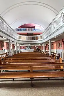 The exterior is unremarkable with cement-rendered walls and artificial slates dating from the 1990 restoration.The exception is the round-headed main door, which is in a portico with fluted pillasters, a pediment and moulded archivolt, dated to 1840. The interior has a balustraded gallery along three sides, supported on an colonnade of five bays with fluted Doric columns. The chancel has a neo-classical reredos with fluted pilasters and a broken pediment. The barrel vaulted ceiling rests on a moulded cornice.[4]