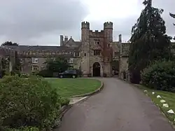 The mansion stands in very close proximity to the church of St Peter.[8] Built of sandstone rubble with Bath Stone dressings, most of the building dates from the mid 19th century or later.[3] The architectural historian John Newman describes the gatehouse as "the most impressive feature" of the mansion[8] and it, and the attached range, are almost the only remaining medieval work. The gatehouse is of three storeys, is constructed of local limestone and has "handsomely battlemented turrets".[8] The upper storeys of the attached range were reconstructed in the 19th century.[8] Newman notes that the house has undergone such significant alteration through its conversion to a hotel that "its historic character has been almost overwhelmed".[8] The gatehouse and range are listed Grade II*.[9] The gardens are listed at Grade II on the Cadw/ICOMOS Register of Parks and Gardens of Special Historic Interest in Wales.[10]