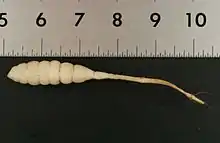This species is a perennial herb producing a hairy, erect stem up to about half a meter in maximum height. It grows from a network of rhizomes with tubers. The distinctive pale-colored tuber is several centimeters long and about one centimeter wide, and is segmented in such a way that it resembles the rattle on the tail of a rattlesnake,[6] the inspiration for the common name "rattlesnake weed".[2] The tuber is also said to resemble "a fat grub".[7] The tuber can reportedly grow up to one meter long in sandy soils.[2] The oppositely arranged leaves have blades up to 5.5 centimeters long borne on petioles up to 3.5 centimeters long. Flowers grow in clusters of 3 to 6 from the upper leaf axils. The tubular, hairy calyx of sepals has pointed lobes. The two-lipped corolla is up to 1.3 centimeters long[6] and white to pink with purple spots[8] or darker lines.[3] The fruit is a schizocarp a few centimeters long that splits in half. The seeds are about a millimeter long.[6]
