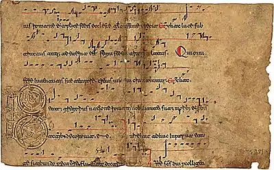 The treatise Musica enchiriadis (c. 900) uses Daseian notation for indicating specific pitches, but the modern use of staff lines is attributed to Guido d'Arezzo (990–1050), whose four-line staff is still used (though without the red and yellow coloring he recommended) in Gregorian chant publications today. Five-line staves appeared in Italy in the 13th century and it was promoted by Ugolino da Forlì; staves with four, five, and six lines were used as late as 1600.[11]