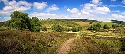 In the north and in the south, the county is hilly, with the southern foothills and uplands of the Pennines in the north, with parts of it in the Peak District National Park,[20] and Cannock Chase an area of natural beauty in the south. Most of the northern upland terrain is in the Staffordshire Moorlands district. In the middle regions, the landscape is low and undulating. Throughout the entire county there are vast and important coalfields. In the southern part, there are also rich iron ore deposits. The largest river is the Trent. The soil is chiefly clay and agriculture was not highly developed until the mechanisation of farms.