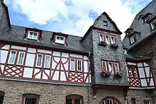 From 1940 to 1942, the castle served as a military hospital. In addition, in November 1940, students from now occupied Luxembourg who had been studying at German and Austrian universities when the war began were forced to attend re-education classes there,[16] and eventually a youth re-education camp was set up. Male schoolchildren and students from Esch-sur-Alzette and Echternach were interned at the castle for 4 months as punishment for protesting against the announcement in 1942 of the introduction of required military service in Luxembourg and the forced conscription associated with it, as well as for participating in the general strike which followed.[17][18] (Girls were sent to a youth hostel at Adenau.) Those of military age were then sent to the front.[19] There is a memorial plaque at the castle, and the State of Rhineland-Palatinate and the City of Bacharach have organised memorial events at which contemporary witnesses spoke.[20]