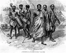 The expedition hired 400 Africans,[8] consisting of four or five Zanzibari 'chiefs' or supervisors including Hamadi bin Malum and Massoudi, about 100 askaris or African soldiers, a number of cooks and personal servants for the whites, and the rest, the majority, were porters or 'pagazis'. Most were from Zanzibar, some were from Mombasa, 40 were hired later in Tabora, Msiri's birthplace.[15] At Bunkeya the expedition also had use of eight tough Dahomeyan askari stationed at Legat's boma on the Lufoi who knew Bunkeya well.[16]